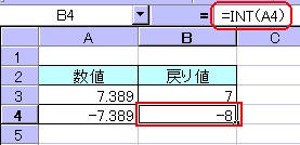 INT関数は、上図左側のように正の数値の場合は、そのまま単純に小数点以下が切り捨てられます。負の場合は、指定した数値より小さい方の整数「-8」となっています。 |