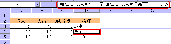 上図は、IF関数とのネストの例です。差し引き値から赤字、黒字の判定をしています。IF関数へネスとさせればいろいろな使い方ができます。 |