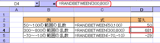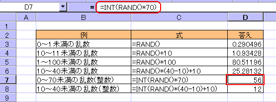 ◆使用例下図はRAND関数で乱数を求めたいろいろな例です。