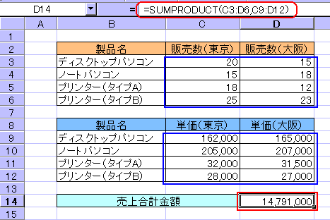 注意点は、同じ地域の販売数と単価は同じ列に配置すること、上下の表の列と行は同じ数にすることです。これが異なれば正しい答えを求めることができません。