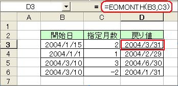 また、B5(2004/3/31)の3ヵ月後の6月は、30日が末日のため2004/6/30が求められています。C6(-2)の負の数で指定したものは、月数前の日付が求められています。