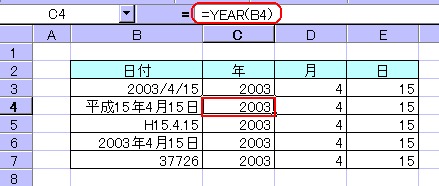 例はすべてセル参照ですが、直接日付を指定する場合は、「=YEAR("2003/4/15")」のように引数を半角のダブル クォーテーション (") で囲みます。