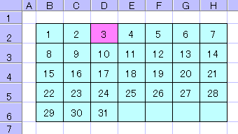 各セルに条件付き書式で「セルの値が」、「次の値に等しい」で「=DAY(TODAY())」とし、書式で背景色の設定をします。そうすると、この例のように毎日、自動的に日付の背景が変わり、今日の日付の確認ができるようになります。 この仕掛けを使って作ったカレンダーを作品紹介コーナーへ「K30 Clendar」として置いてあります。参考にどうぞ。 |