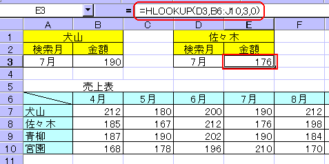 列番号は、「佐々木」の売上金額(範囲内で上から3行目)なので、「3」としています。検索の型は、完全に一致する値とするため「0」としています。 =IF(D3="","",HLOOKUP(D3,B6:J10,3,0)) として回避することができます。 なお、このような表の場合、VLOOKUP関数でも検索することは可能です。 |