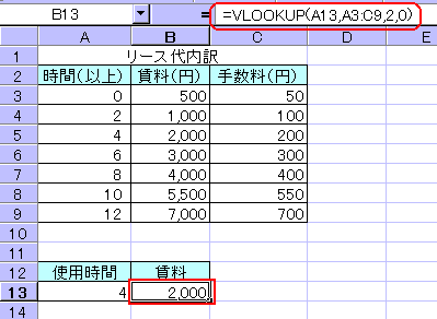 最下段の例では、検索の型を省略し、使用時間7時間という、中途の時間の賃料を求めています。結果は、3,000円となっています。検索の型を省略する場合と指定する場合の違いを理解しましょう。