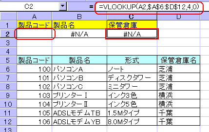 このようにエラー値が返されていても、特に問題なければそのままでもいいのですが、かっこよく見せるには、もう一工夫必要です。 =IF(A2="","",VLOOKUP(A2,A6:D12,4,0)) とすれば、検索値の製品コードが空白の場合は、空白を返し、検索値が入力された場合のみVLOOKUP関数が検索します。 |