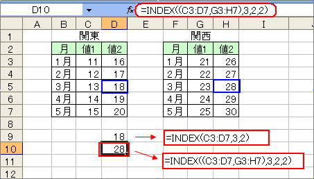 ■INDEX関数INDEX関数は、表やセル範囲から行と列で位置を指定して、セル参照を求めたり、該当位置のデータを求める関数です。 書式で表すと、INDEX(範囲,行番号,列番号,領域番号)