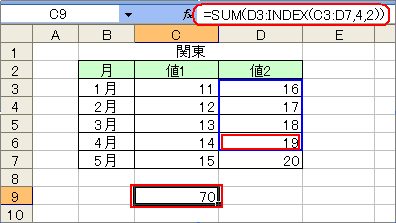 すなわち、INDEX(C3:D7,4,2)で「D6」を返しているからこそSUM(D3:D6)となり、合計「70」が求められているわけです。