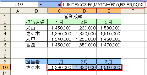 C10〜E10の式は、INDEX関数の行番号をMATCH関数で求め、列番号は