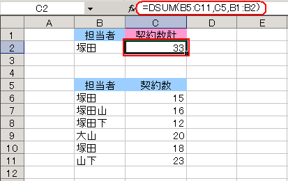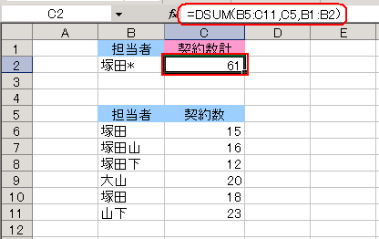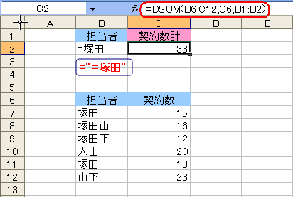 よってこの場合、担当者「塚田」の契約数計を求めるには、Criteriaの条件を「="=塚田"」とすべきなのです。 次図は、このヘルプに基づき正解を求めたものです。
