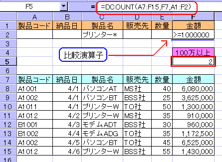 例では、650万以上の売上が”TO社”1社なので答えが求められていますが、条件を満たすレコードがない場合や、複数ある場合は、所定のエラー値が返されます。 ※例では、「パソコン*」とワイルドカードを使っていますが、このような場合、エクセル97、2000、2003では単に「パソコン」でも同じ結果を求めることができます。ただし、要注意です。 |