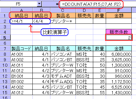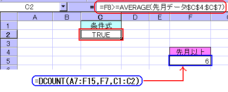 ◆使用例 2下図は、検索条件に数式を使った例です。同じ販売リストから、先月データシートの平均値より多い金額の回数を求めたものです。条件式 =F8>=AVERAGE(先月データ!$C$4:$C$7)は、先月データの平均と金額の先頭レコード(F8)を比較した論理式になっています。(リストは、上図参照)