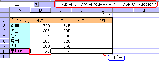 上図のような売上高の平均値を求める場合、通常AVERAGE関数を使いますが、参照範囲にデータが未入力であれば、エラー値「#DIV/0!」が返されます。たとえば、=AVERAGE(D3:D7)では、D3:D7にデータが未入力のため「#DIV/0!」が返されます。実務では、あらかじめ数式を組んでおく場合が多く、そのままでは体裁が悪いものです。 ※上記の式でIF関数の論理式の引数はISERROR(AVERAGE(B3:B7))ですが、A=Bのように右辺と左辺の比較(論理式)になっていません。これは、ISERROR関数が論理値を返す関数なので、そのまま引数として使えるからです。他の関数でも論理値を返すものは、論理式の引数として使えます。