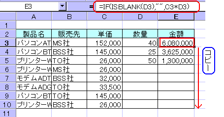これによって、数量が入力されている場合のみ計算させることができます。 なお、この例のような場合は、ISBLANK関数を使わずE3に
