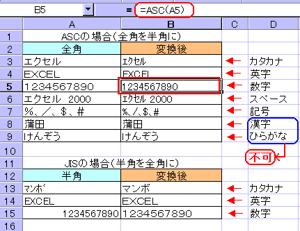 ASC、JIS関数は、全角と半角が混在したデータを統一する時に便利です。 |